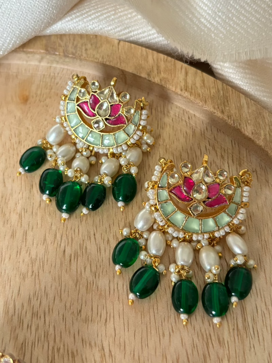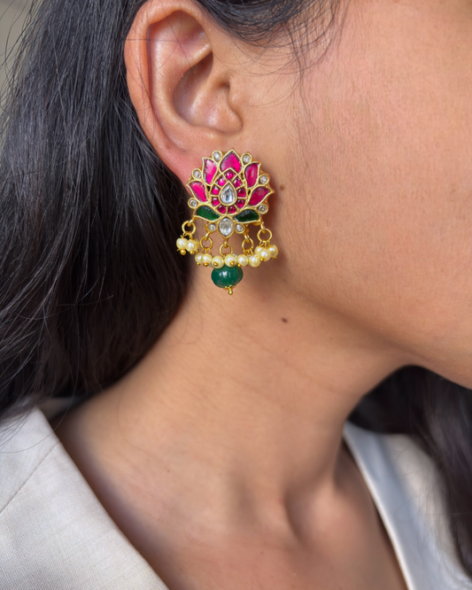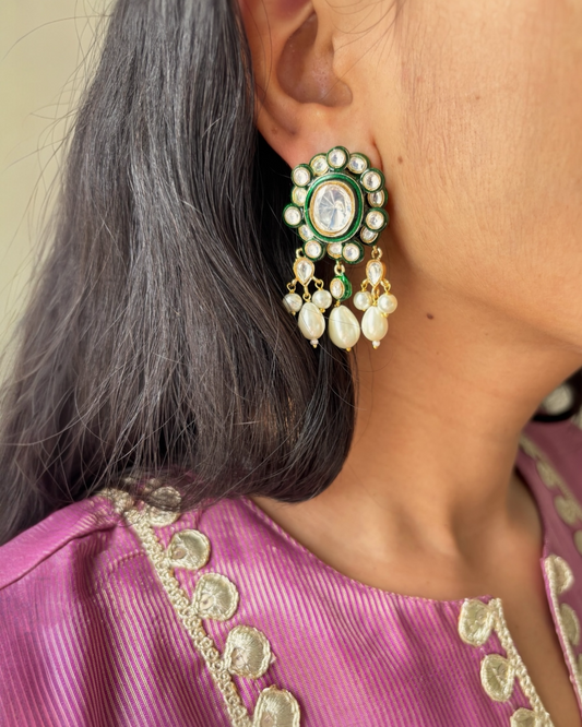 URMI DAGA in one our favourite "Vidhi" Kundan earrings styled effortlessly with a classic pink kurta.