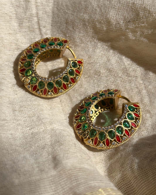 Maagi in our Rajwada Jhumkas, paired with a classic red suit — super regal and timeless